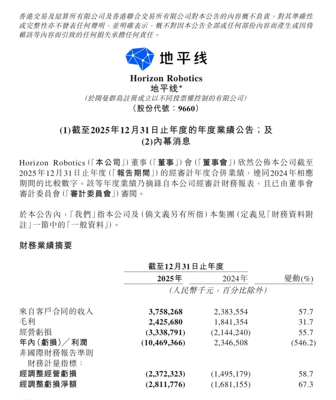 财报中最受关注的,无疑是地平线过去一年从盈利到巨亏的转变。2025年地平线年内亏损104.69亿元,较2024年的盈利23.47亿元大幅波动,经调整亏损净额达28.12亿元,同比扩大67.3%。不过这一变化并非业务基本面恶化,而是多重因素叠加的结果。