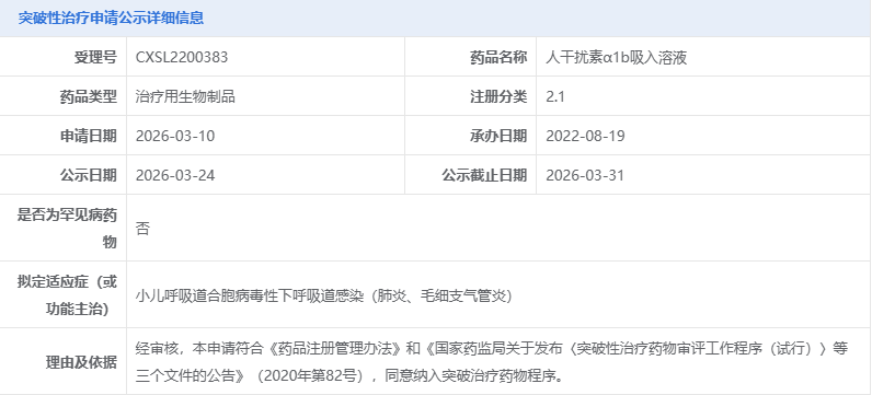 今日(3月24日),据CDE官网最新公示:科兴制药全资子公司深圳科兴药业有限公司自主研发的人干扰素α1b吸入溶液,拟被纳入突破性治疗品种名单,拟定适应症为小儿呼吸道合胞病毒性下呼吸道感染(肺炎、毛细支气管炎)。