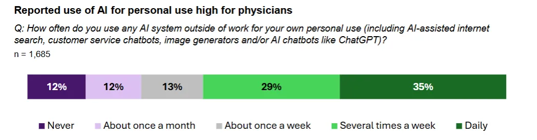 不止如此,超75%医生每周至少一次在私人生活中使用 AI,35%每日使用,AI已深度融入医生日常。
