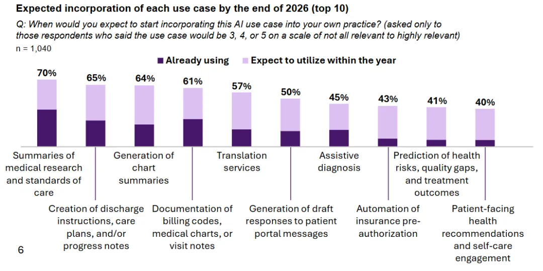 最希望引入的场景仍以文档和诊断为主,包括医疗研究总结、辅助诊断、健康风险预测等。