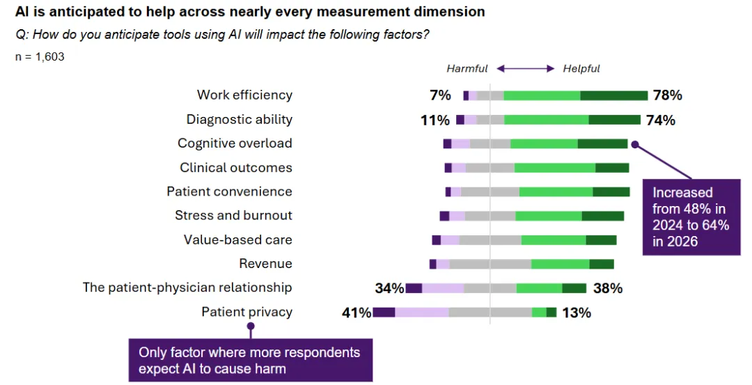 医生们预计,Al将会对工作效率(78%认为有益)、诊断能力(74%)、临床结果、患者便利度、缓解医生职业倦怠、认知负荷以及其他诸多方面产生积极影响。