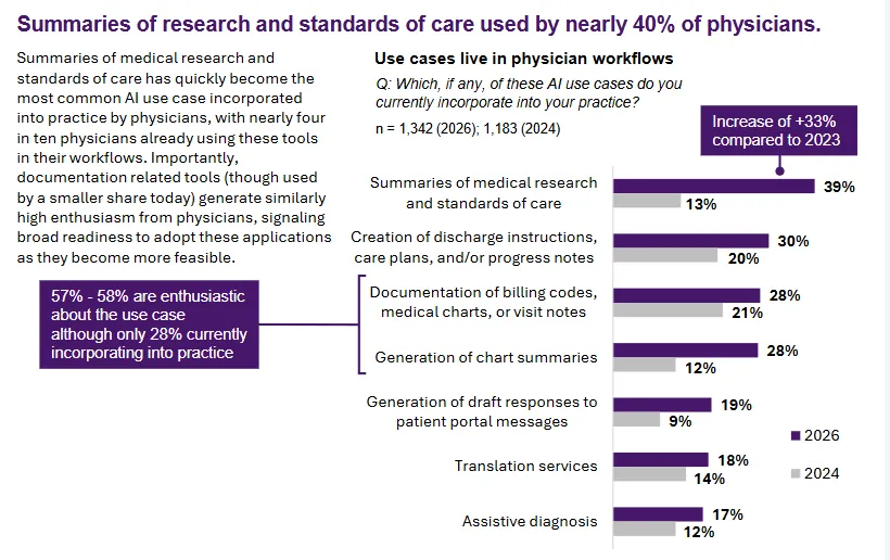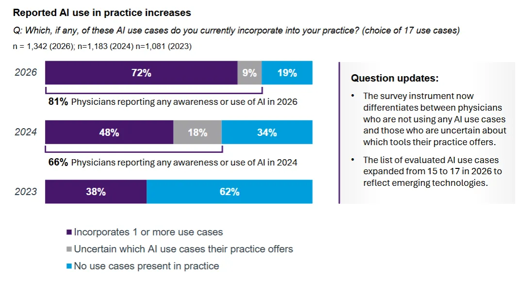 医生们对当下各类 AI 工具摸不清的比例,则从2024年的18%降到了2026年的9%。