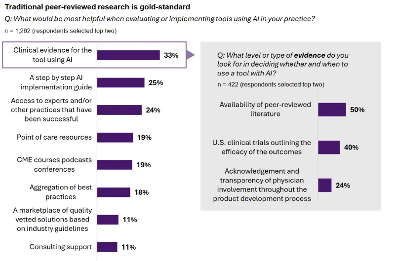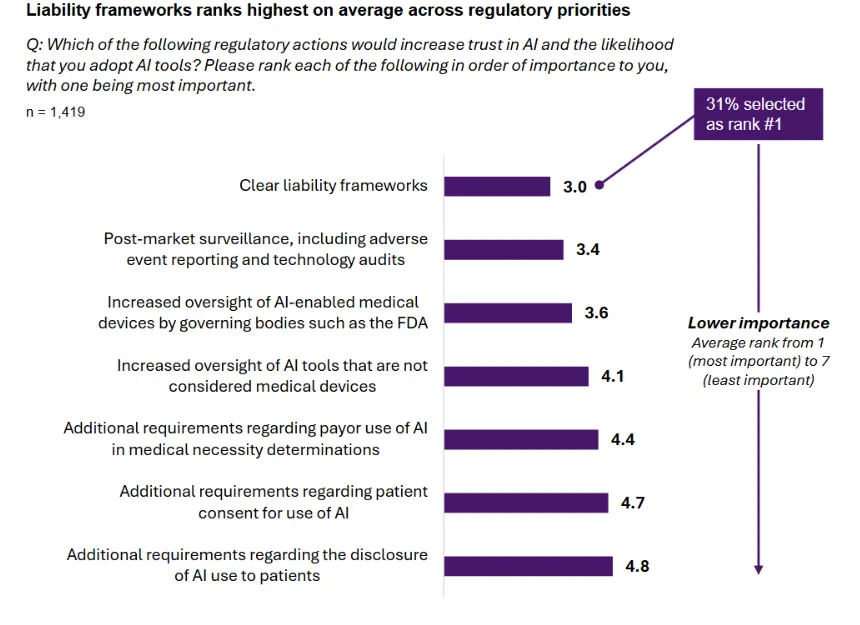 当被问及“哪项监管举措将能增强对Al的信任并提高采纳Al工具的可能性”时,医生最看重的是明确的责任框架。