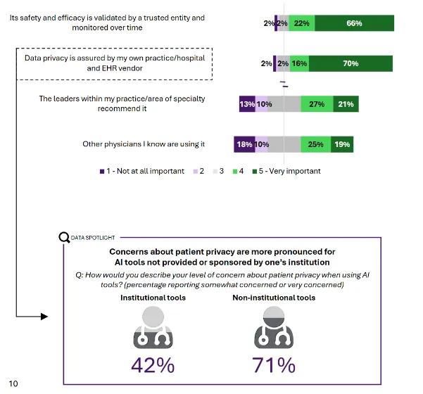 医生对非机构提供的 AI 工具隐私担忧(71%)远高于机构工具(42%)。