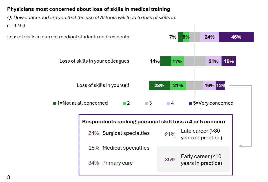 88% 医生对 AI 导致的技能流失存在不同程度担忧,其中 70% 高度担忧医学生和住院医师的技能流失。