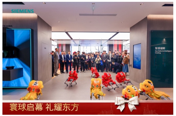 在开业典礼的核心环节,西门子家电巧妙地将传统仪式与智能科技相结合,打造了一场别开生面的“纳福”盛典。随着定制红色丝带剪下,幕布拉开,一场融合了传统舞狮与现代科技的“赛博舞狮”表演惊艳全场。两组真人舞狮与八组