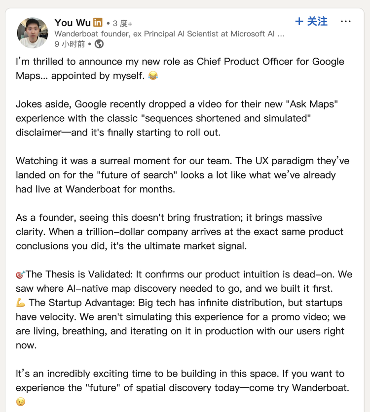 Google 的Ask Maps抄了Wanderboat的作业,不过Wanderboat的“作业”远不止于此。