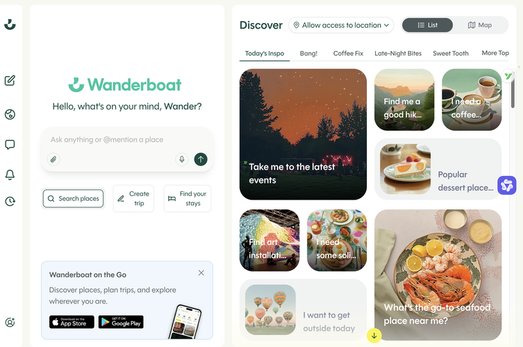 Wanderboat 给人的使用体验,有AI版的小红书、大众点评和马蜂窝的结合体的味道。