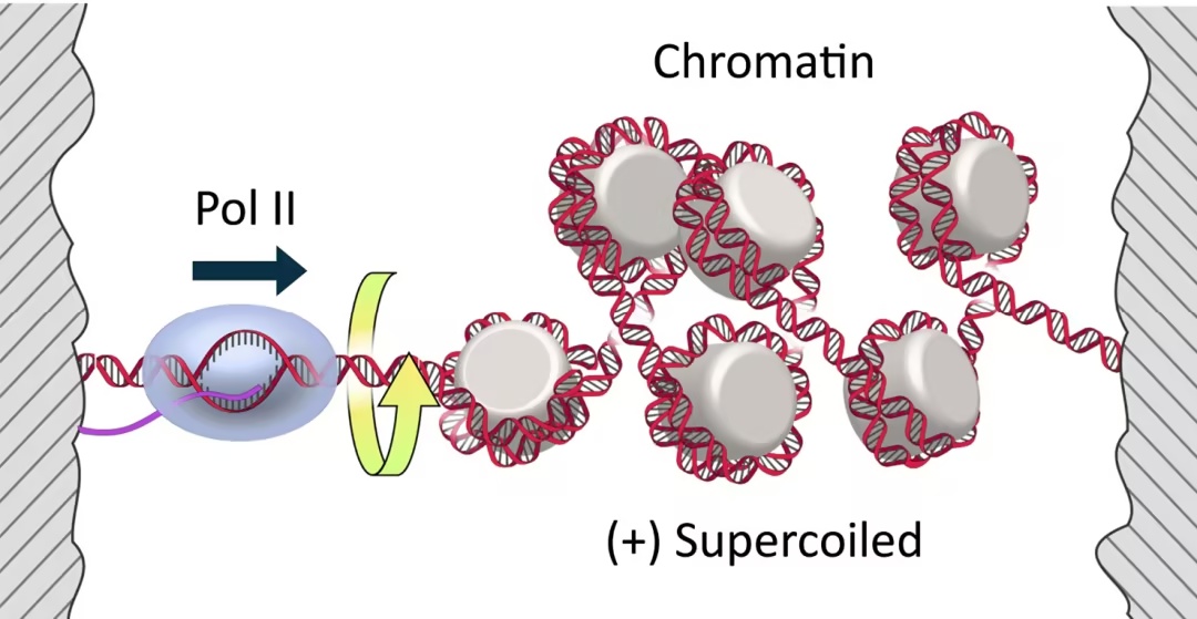 DNA 的手性结构——右手螺旋结构——决定了转录过程必然会产生拓扑方面的挑战。当 RNA 聚合酶 II(Pol II)沿着 DNA 进行移动时,它还必须同时相对于 DNA 进行旋转,从而在前方产生正向(+)的 DNA 超螺旋结构,这反过来又会阻碍转录过程。