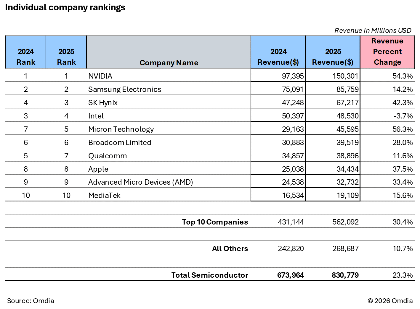自 2023 年以来半导体收入的大幅增长也导致了最大公司之间的市场份额集中。虽然 2023 年至 2025 年期间整个半导体市场收入增长了约 53%,但前十大半导体公司的收入增长了 90%,而其余市场的增长率为 8%。增长主要集中在存储器供应商和英伟达公司,这凸显出人工智能需求对半导体市场的影响之大。这四家公司合计在 2025 年的半导体总收入份额从 2023 年的 24%增长至 42%。