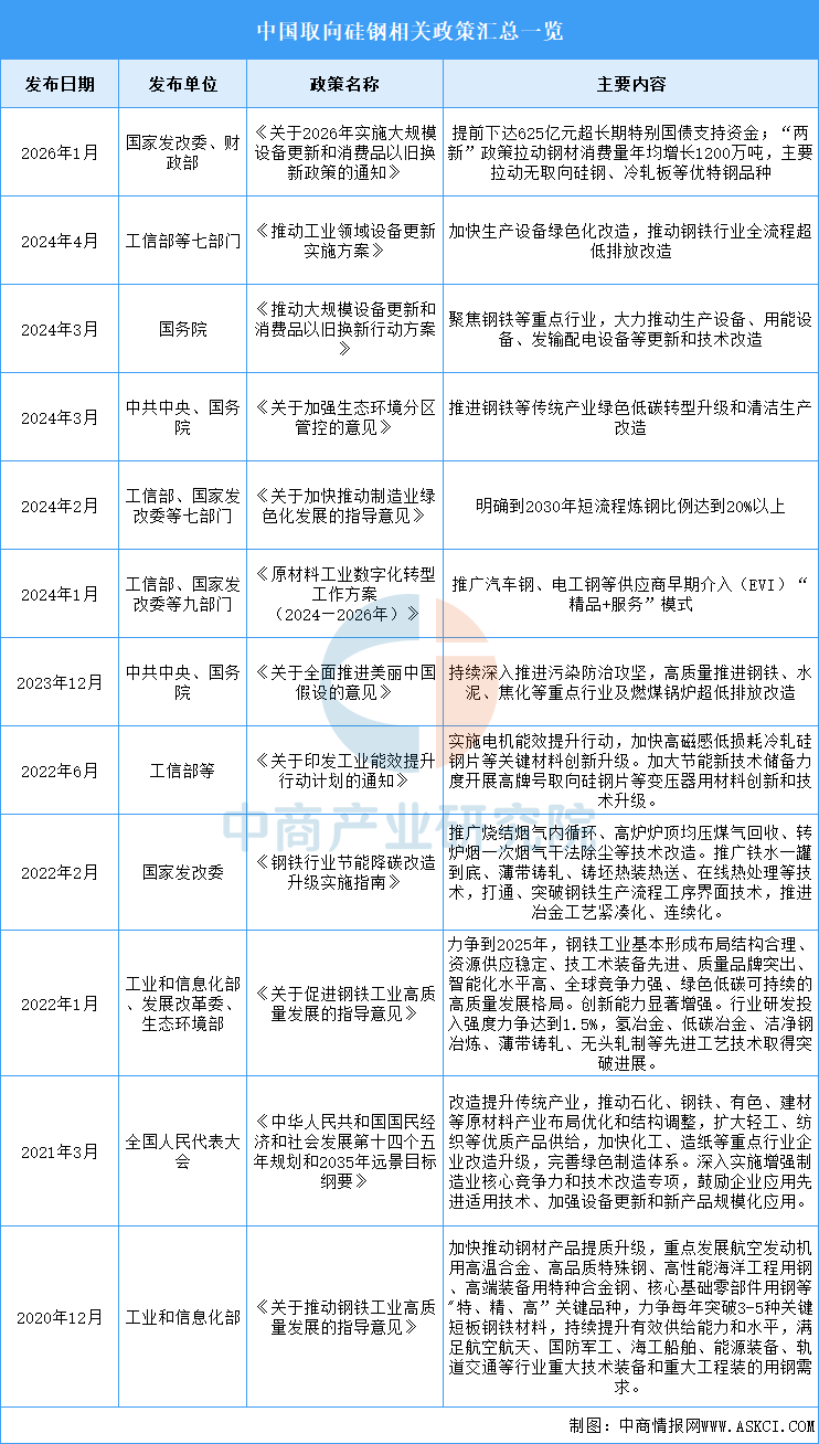 取向硅钢的制造技术高度复杂、工艺窗口极为狭窄,且对成分的控制要求极为严格,因此代表了一个国家钢铁制造业的综合技术水平。为实现我国关键电力设备自主保障、避免受制于人,国家出台了一系列宏观调控政策,以产业升级和节能环保为重心,推动取向硅钢行业的健康、有序发展。