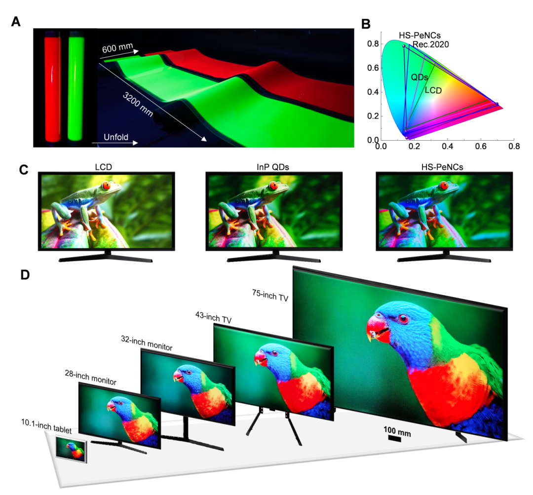 在显示应用中,研究团队成功制备并展示了从 10.1 英寸平板、28–32 英寸显示器到 43–75 英寸电视的原型器件,色域面积覆盖超过 97% Rec.2020,亮度均匀、色彩纯净。在固态照明领域,其高光转换效率有望显著降低能耗损失(图4B-D)。