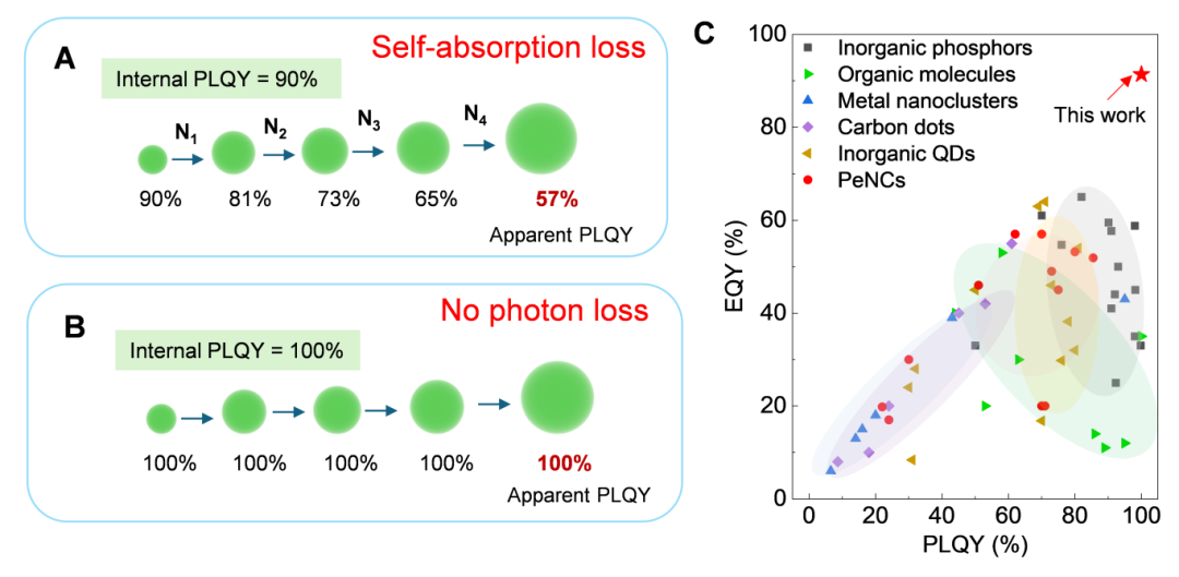 其中,PLQY 描述的是材料在吸收光子后,有多少比例能够以发光的形式释放能量。即使 PLQY 接近 100%,若吸收率不足,EQY 仍然受限;反之,在高吸收的固态体系中,PLQY 往往因自吸收和浓度猝灭而显著下降。这一内在矛盾通常使得绝大多数固态发光材料的 EQY 长期受限于约 65% 的水平。
