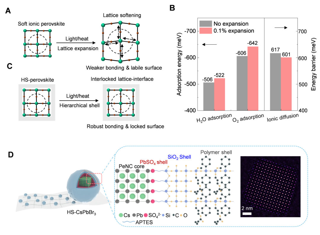 该论文研究发现,这种光致或热致晶格膨胀并非无害的热涨冷缩,而是会显著削弱离子键强度,降低离子迁移和化学降解的势垒,进而触发一系列连锁反应:卤素离子迁移加速、表面配体失稳、氧气和水分子更易吸附并参与反应,最终导致表面氧化、水解以及晶体结构破坏 (图1B)。