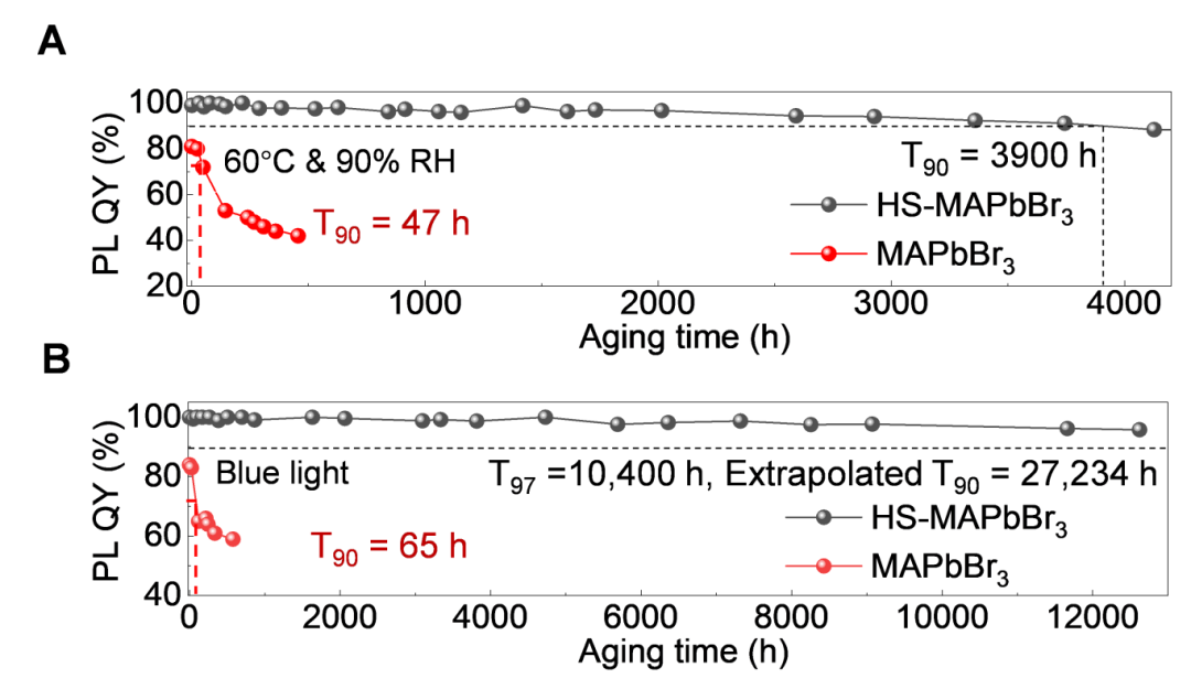 图2: HS-钙钛矿量子点的湿热(60 °C、90% 相对湿度)和蓝光 LED辐照稳定性