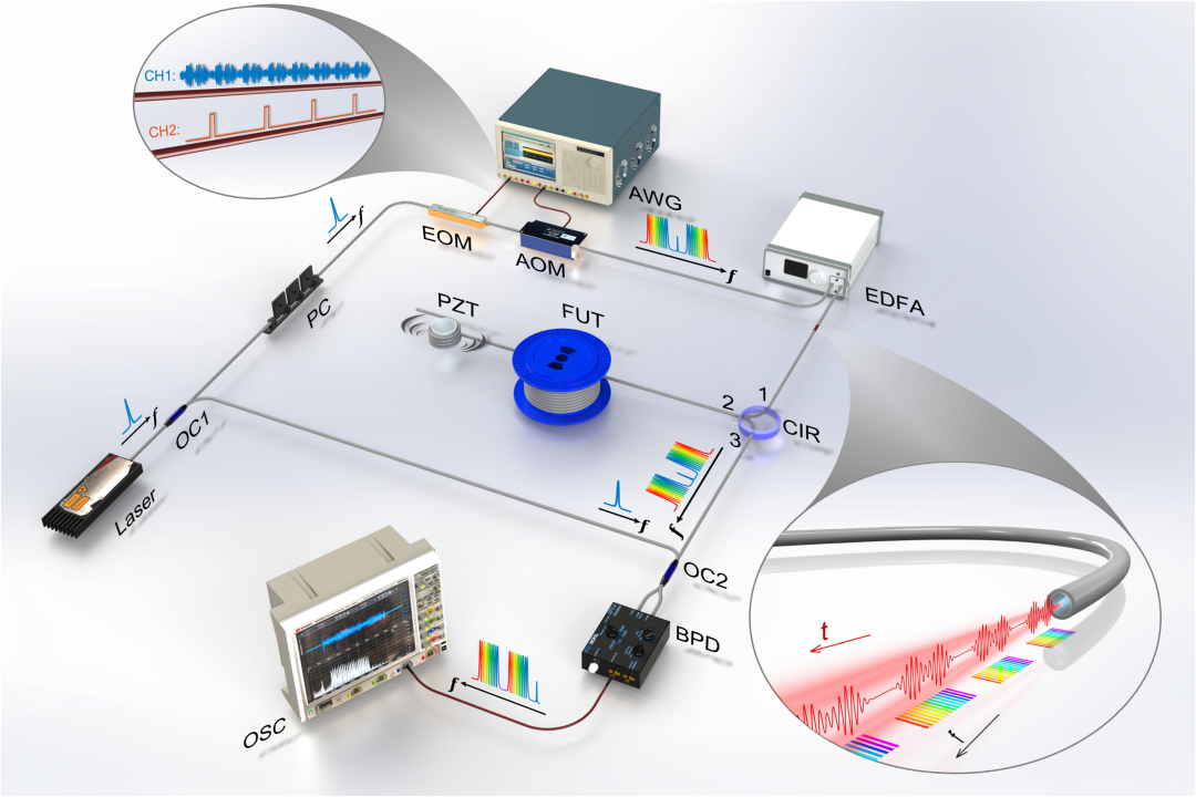 光谱分析和相位解调是实现对外界扰动定量探测的两条主流技术路线,然而现有技术不可避免地存在测量速度和动态应变测量范围之间的权衡。光谱分析方法依赖耗时的逐频扫描过程以获取宽带光谱信息,测量速度缓慢,难以捕捉高频扰动;相位解调方法则受制于相位累积恢复过程的回转速率,应变测量范围小,难以满足复杂工程应用需求。因此,如何在保持高灵敏度的同时,实现高速、宽动态范围的分布式光纤振动探测,已成为该领域亟待解决的关键难题。