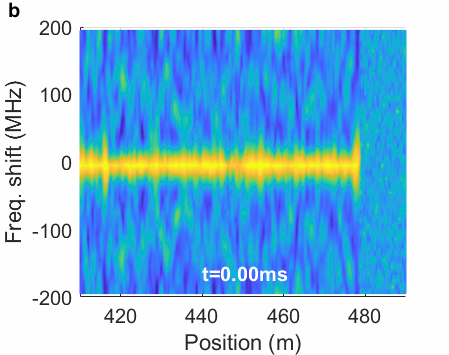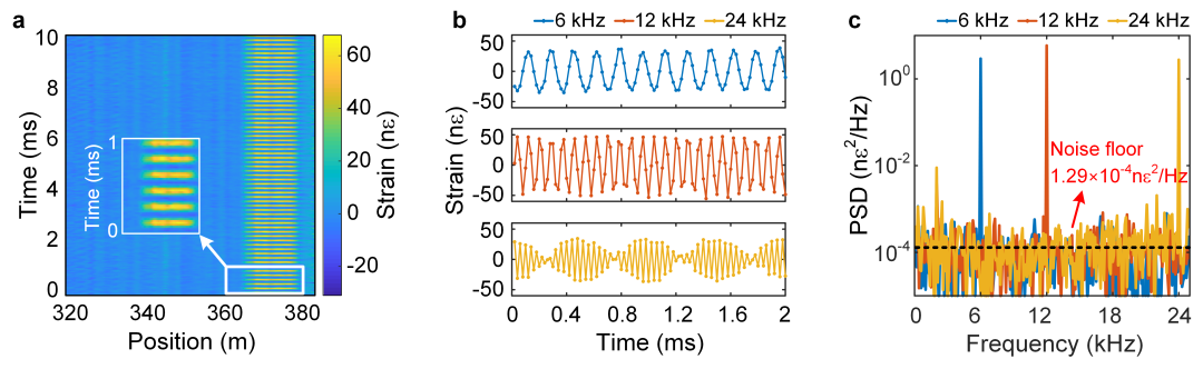 研究团队还进一步研究了该方案对高频振动信号的探测能力(图4)。基于一个频梳序列重频为50kHz的传感系统,实现了对接近奈奎斯特采样频率(25KHz)的24kHz高频振动信号的探测,如图4所示,相比同样带宽和频率分辨率条件下的传统光谱分析方案频响极限高出一个数量级。此外,实测结果在接近系统25kHz奈奎斯特采样频率极限的同时,还将系统的噪声基底抑制在11.4pε/√Hz水平,在频率响应和探测灵敏度两方面同时具备突出表现,其综合性能显著优于既有的光谱分析方案。