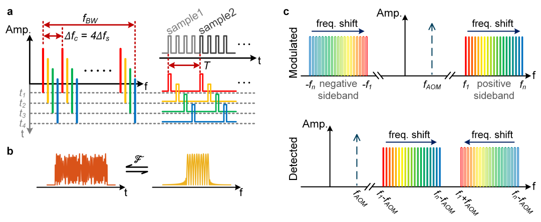 面对以上矛盾,研究团队创新性提出频梳相关光谱反射仪分布式光纤声波传感技术。光频梳是由数字域生成的一系列等间隔、相干性良好的离散谱线组成,这为传感系统的宽带瑞利光谱解调提供了一种兼顾超高精度和灵活可调优势的解决方案。依据瑞利散射理论模型和奈奎斯特采样定理,研究团队引入频梳探测光替代传统单频光源,提出了频率交织的双边带光频梳配置方案(图1),利用频梳探测光对光纤本征的瑞利散射光谱进行并行采集,使系统的有效采样率不再受探测频率数量限制,由此突破了探测速度和动态应变测量范围难以兼得的关键瓶颈,使光谱测量从串行迈向并行,从根本上颠覆了传统逐频扫描的工作机制,系统的动态响应能力相比传统逐频扫描探测技术路径实现了数量级的跨越。