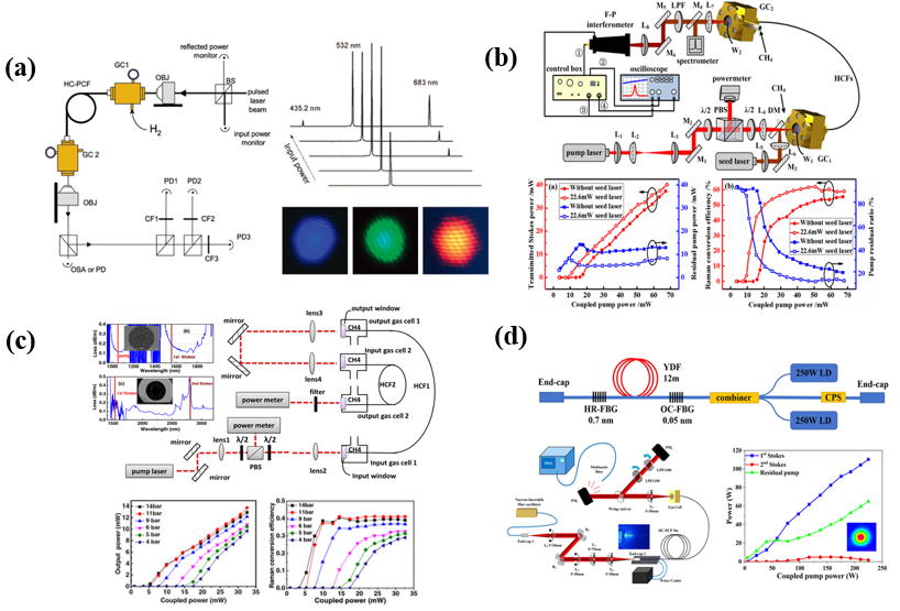 图2 基于SRS的HCFGL代表性实验装置示意图和结果。(a) 首个HCFGL;(b) 1.5 μm波段空芯光纤甲烷气体激光;(c) 级联结构的中红外波段HCFGL;(d) 110 W高功率HCFGL