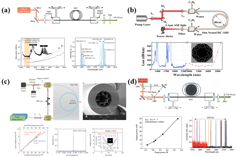 图1 基于粒子数反转的HCFGL代表性实验装置示意图和结果。(a) 4.8 μm空芯光纤CO气体激光;(b) 高功率空芯光纤C2H2气体激光;(c) 高功率空芯光纤HBr气体激光;(d) 大范围阶跃调谐输出的空芯光纤HBr/CO混充气体激光