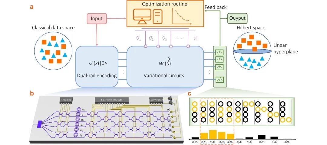 在众多实现量子计算的硬件平台中,光子平台以其能够在室温运行、抗环境噪声能力强以及易于大规模芯片集成等独特优势脱颖而出。然而,光量子计算也面临着一个困难:光子之间的相互作用具有概率性,往往需要通过“后选择”机制(即只保留成功的运算结果)来实现逻辑门。这意味着,如果像搭积木一样简单地把多个逻辑门级联起来,总体的成功概率会随着深度增加而出现指数级骤降,导致复杂的深度量子算法难以在目前的光子芯片上落地。因此,如何高效地在光子平台上实现量子嵌入,并绕过这种“成功率陷阱”,成为了推动量子人工智能走向实用化的关键一步。