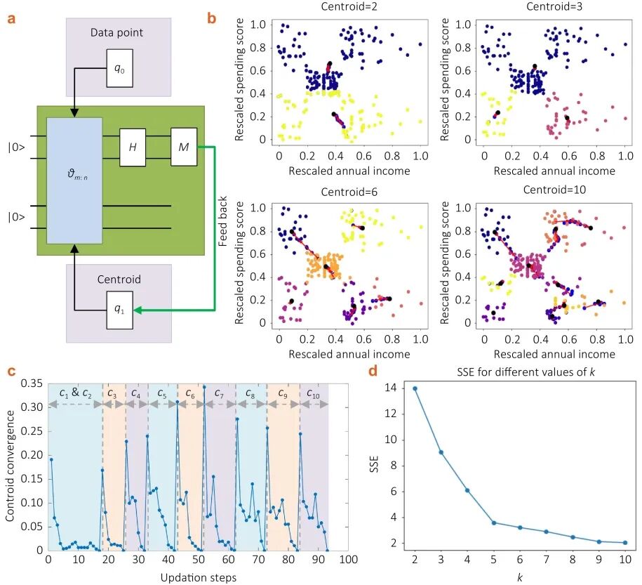 最后在量子 K-means 聚类任务中,利用量子增强的距离估计技术实现了对复杂数据拓扑结构的自动识别与精准聚类。研究结论表明,通过整体优化变分映射矩阵,可以在有限深度的光子芯片上获得极强的非线性表达能力与噪声耐受力。这一成果不仅在理论上统一了光量子算法的合成与嵌入学习过程,更在实践上为光量子芯片在状态区分、数据分类及聚类分析等领域的应用提供了工具,对于加速集成光量子处理器在未来人工智能任务中的商业化落地具有深远意义。目前该工作以“Quantum Embedding Learning on Variational Photonic Quantum Circuits”为题发表在Intelligent Opto-Electronics 2025年第2期。