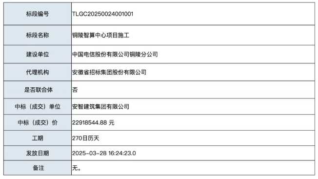2025 年 2 月 27 日,中国电信股份有限公司铜陵分公司发布《铜陵智算中心项目施工》招标公告。