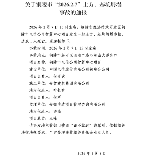 2026 年 2 月 11 日,安徽省住房和城乡建设厅发布《铜陵市“2026.2.7”土方、基坑坍塌事故的通报》。