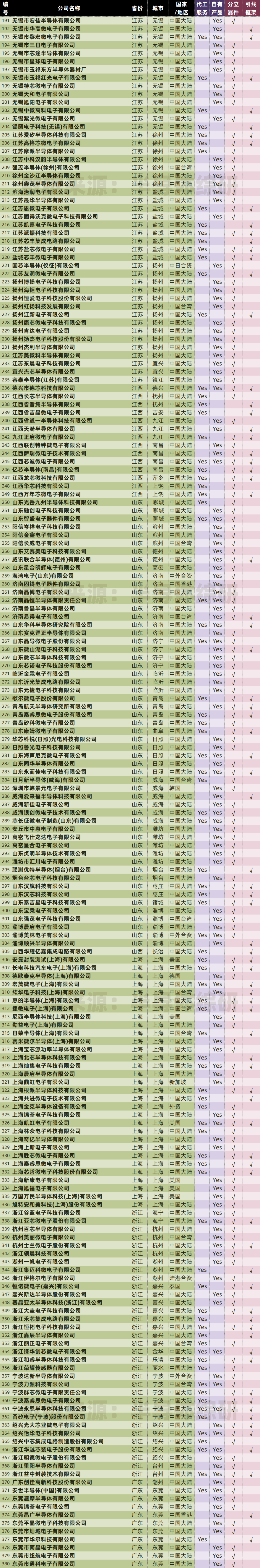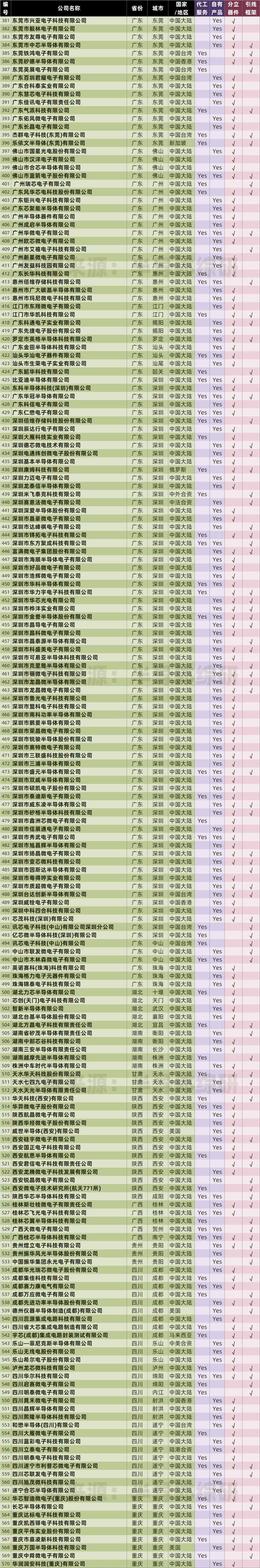 在我统计的表格,里中国大陆现存的封装产线已经达到了778家,而其中拥有分立器件或集成电路引线框架封装能力的产线高达570家。由于数量太大,我不得不把一个表格拆成三分才能发布。图表比较长,麻烦大家耐心观看和参考 ...