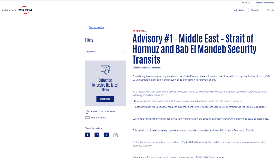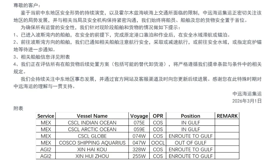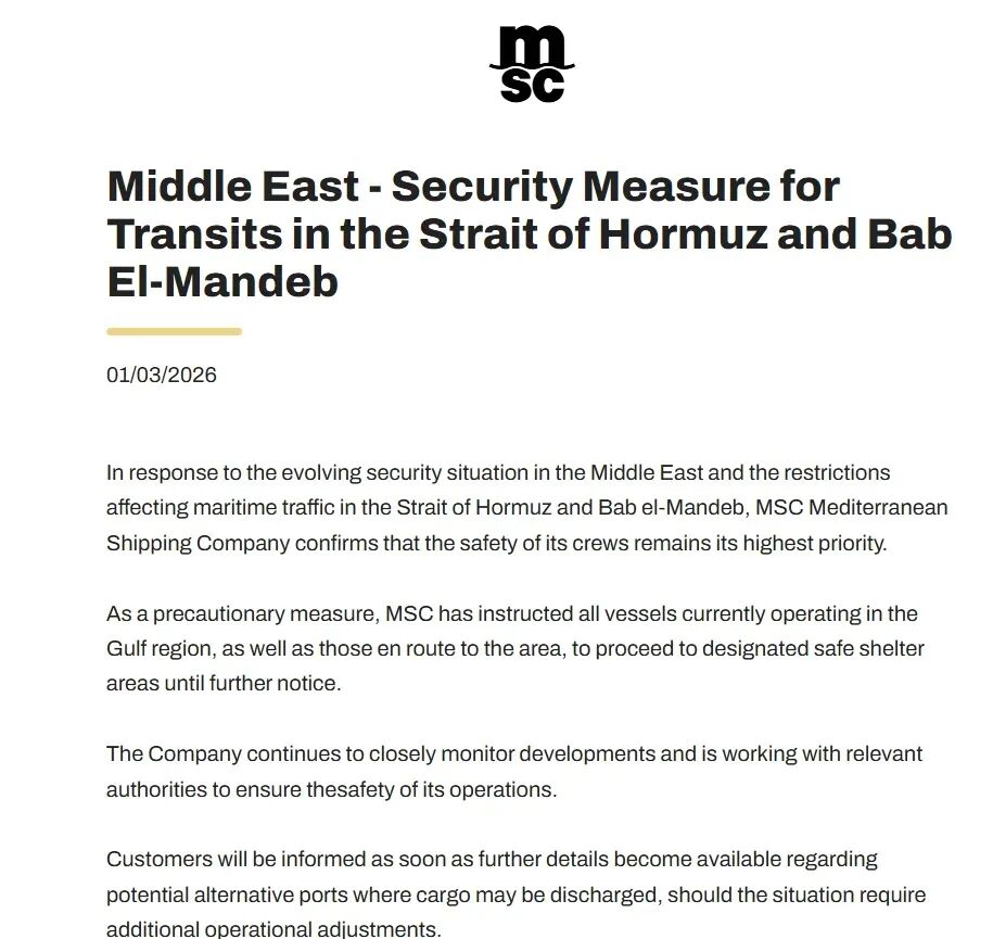 MSC在官方客户通告中称,鉴于中东安全局势与霍尔木兹及曼德海峡海上交通受限,已指示所有在海湾运营及正驶往该地区的船舶前往指定安全避难区域,直至另行通知,并将与相关当局合作,必要时告知客户替代卸货港方案。