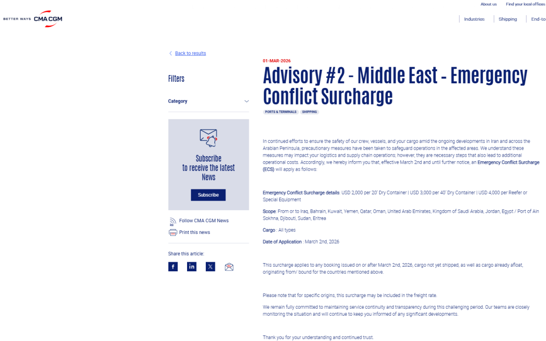 同时发布“Emergency Conflict Surcharge(ECS)紧急冲突附加费”,自2026年3月2日(装货日)起适用于相关范围货物: