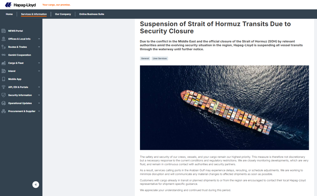 赫伯罗特在客户公告中明确表示,在安全形势演变与监管限制影响下,将暂停船舶通过霍尔木兹海峡,并强调船员、船舶与货物安全为最高优先事项;涉及阿拉伯湾港口的服务可能出现延误、改道或船期调整。