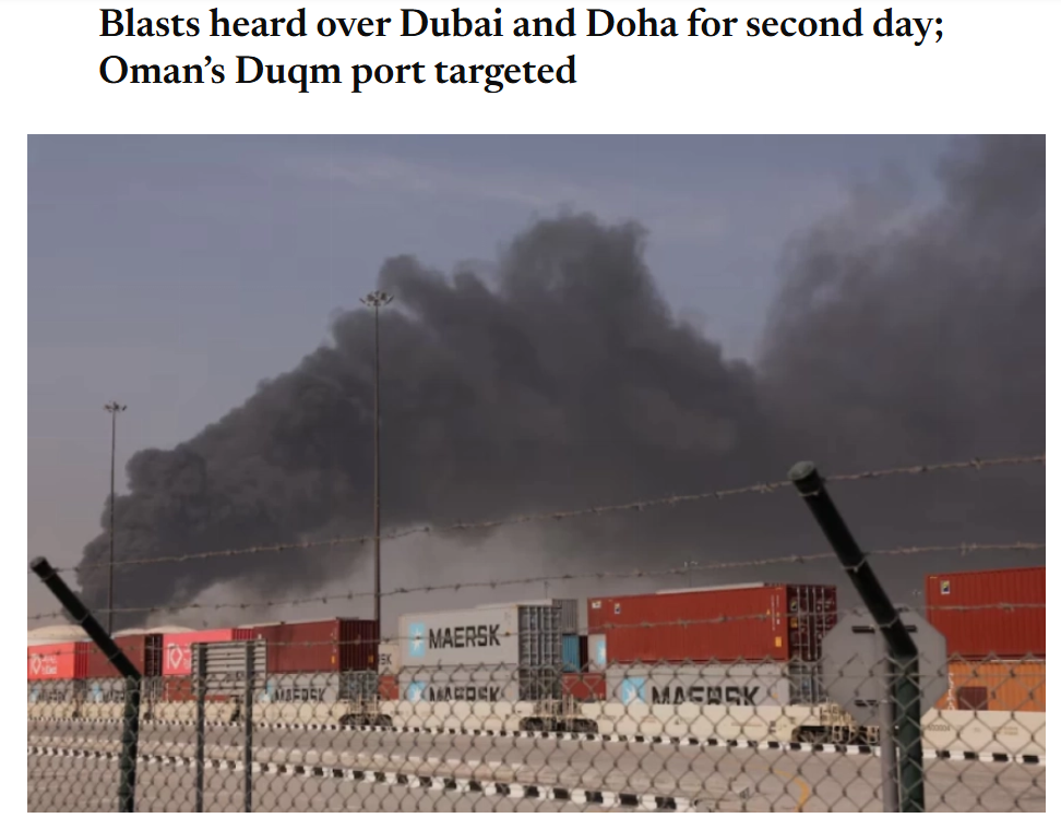 2)海湾枢纽港口与关键节点受波及:杰贝阿里暂停、阿曼杜库姆受袭、巴林临停