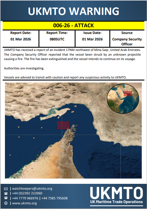 另据UKMTO通报,一艘船舶在阿联酋Mina Saqr港西北约17海里处于08:05 UTC遭不明抛射物击中,引发船上起火,火情随后被扑灭,该船拟继续航行;不过该通报未披露船名及更多船舶信息。