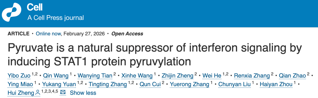 [1].Zuo et al., Pyruvate is a natural suppressor of interferon signaling by inducing STAT1 protein pyruvylation, Cell (2026), https://doi.org/10.1016/j.cell.2026.01.023