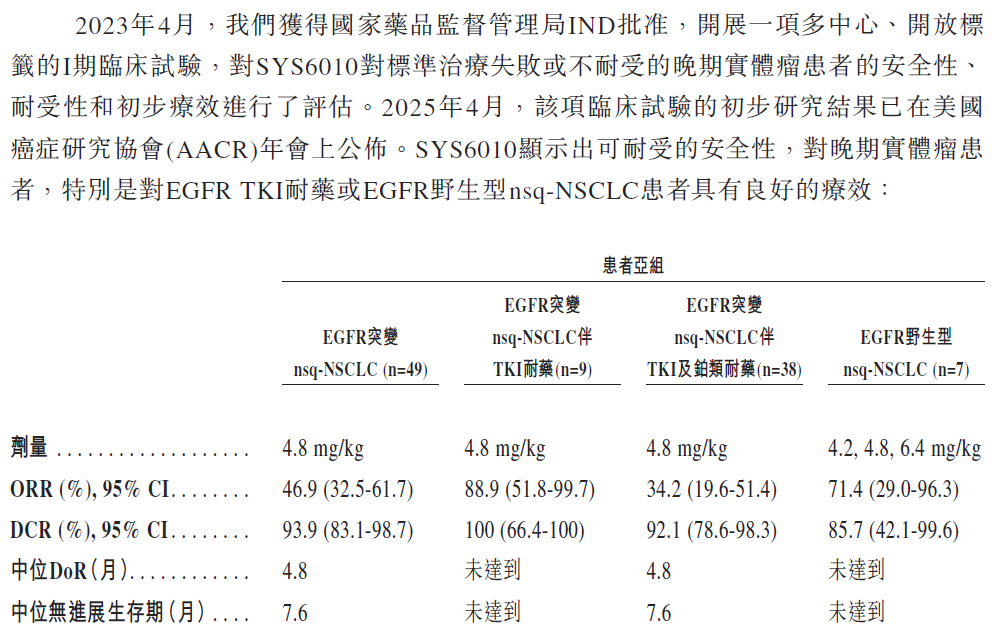 的SYS6010采用TOP1i作为payload,DAR值为8,在NSCLC初步临床中表现出优异疗效,EGFR突变型非鳞状NSCLC的ORR为46.9%,DCR为93.9%,EGFR野生型非鳞状NSCLC的ORR为71.4%,DCR为85.7%。