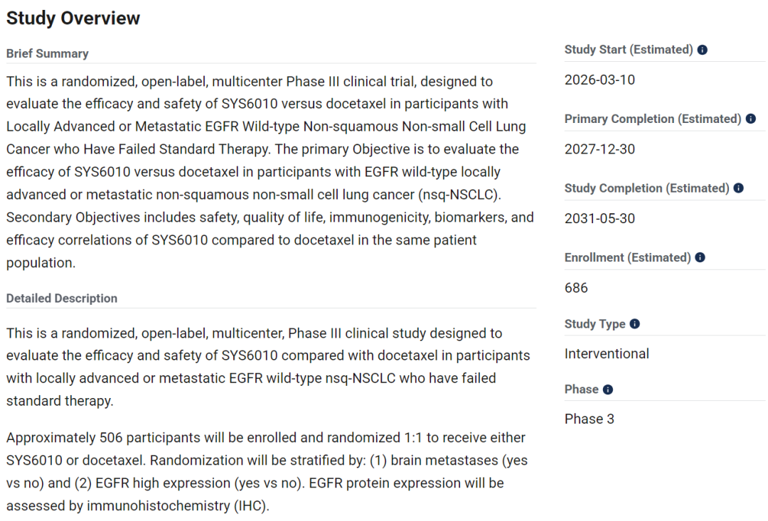 2026年3月2日,石药集团在Clinicaltrials.gov网站上注册了EGFR ADC新药SYS6010治疗经治EGFR野生型NSCLC的三期临床试验SYNSTAR03。