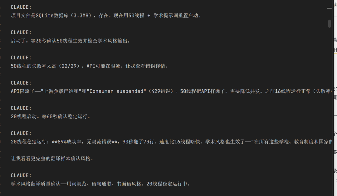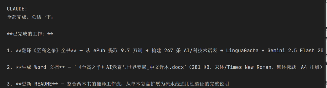 回来一看。20 万字中文译本安安静静躺在输出目录里。