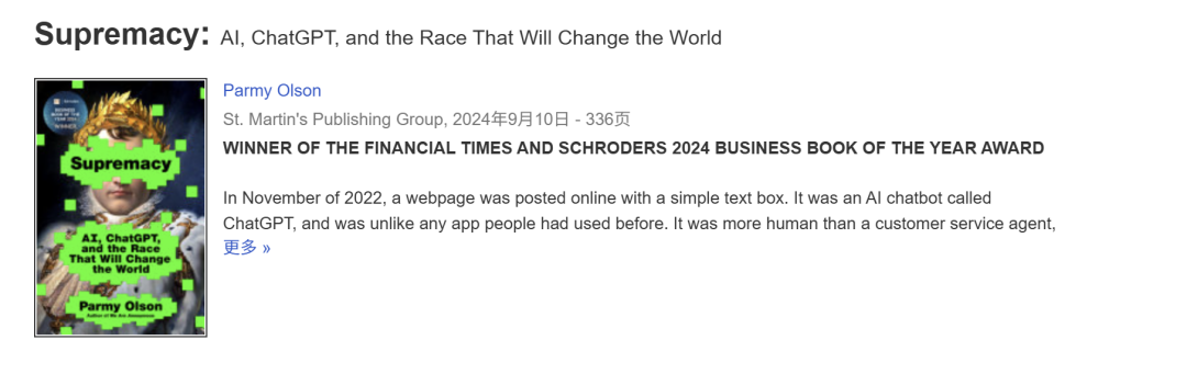 《至高之争》,Parmy Olson 写的,讲 OpenAI 和 DeepMind 怎么从实验室一路杀到全球 AI 竞赛。Sam Altman 和 Demis Hassabis,两个性格完全不同的人怎么各自押注。ChatGPT 发布前夜那些人在想什么、做什么。336 页,9.7 万英文词。