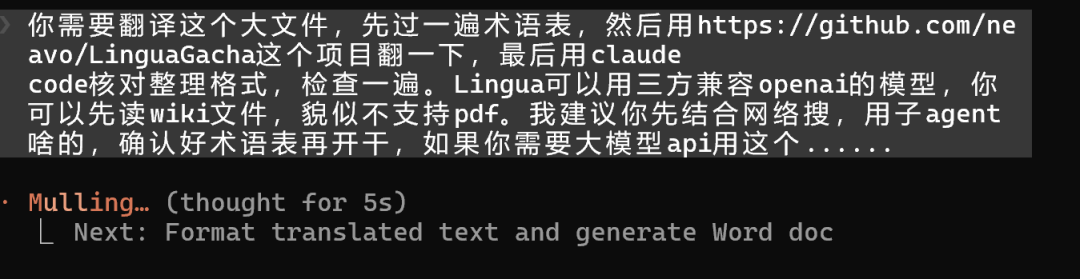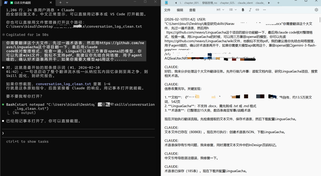 我懒得自己学 LinguaGacha 怎么用,就打开 Claude Code,把 docx 文件路径丢进去,后面跟了四句话,让他自己学 LinguaGacha,自己翻译、自己整理: