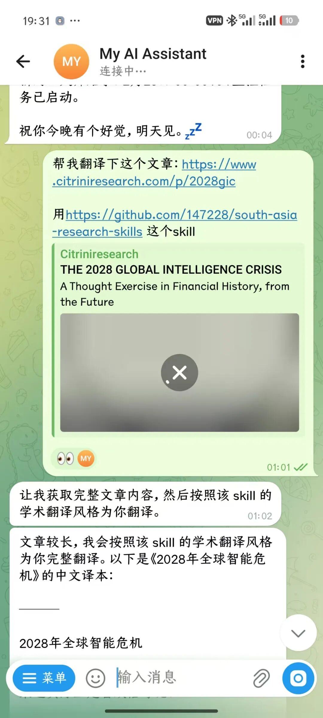 机器人秒回:"让我获取完整文章内容,然后按照该 skill 的学术翻译风格为你翻译。"