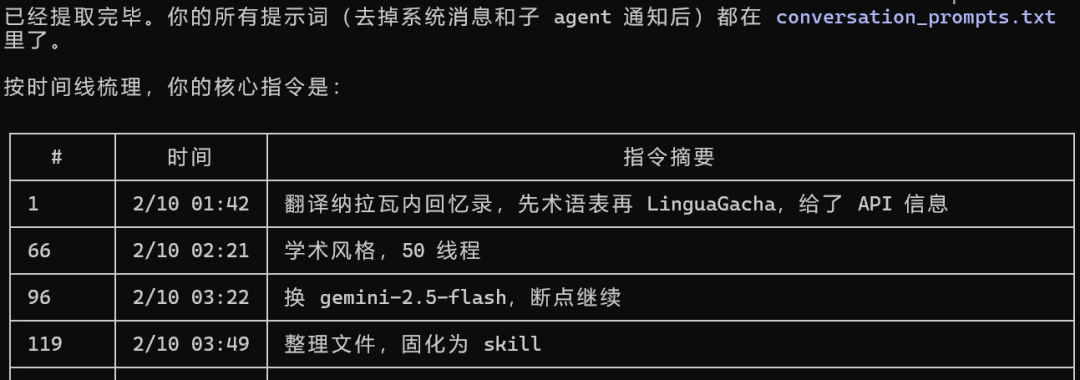 14 条指令变 1 条。一天变半天。领域从军事换成 AI,格式从 Word 换成 ePub,术语表从 185 条换成 247 条。所有这些变化,Agent 自己搞定了。