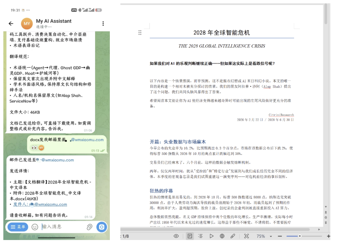 几分钟后,一份完整的中文译本出来了。术语统一(Agent→ 代理、Ghost GDP→ 幽灵 GDP、Moat→ 护城河),学术书面语风格,人名机构名保留原文。46KB 的 docx。