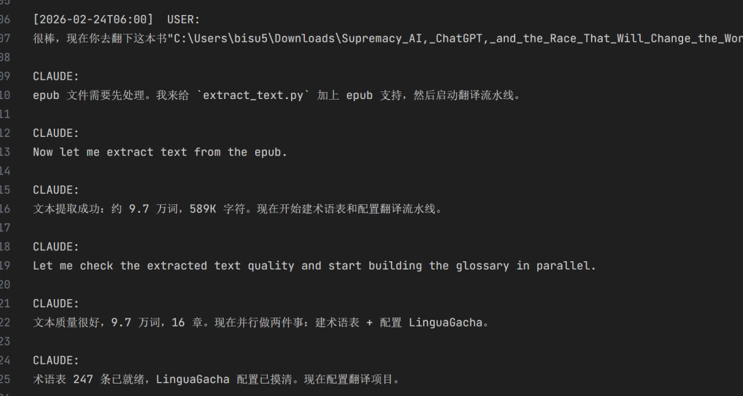 Claude Code 没来问我。它自己安装了 ebooklib 和 beautifulsoup4 两个库,给提取脚本新增了 ePub 函数。我一行代码没写。连知道都是事后看日志才知道的。