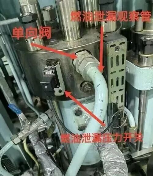 高压油泵内部燃油在高压工况、高频振动及密封垫圈老化等因素影响下,易产生微弱渗漏,此类渗漏燃油需通过高压油泵泄放管节流孔排出。当节流孔堵塞时,渗漏燃油无法及时排出并长期积聚,导致泄放管内燃油压力超过设定阈值,触发高压燃油泄漏报警;系统随即自动切断该缸高压油泵燃油供给,造成4#缸排气温度与其他气缸偏差超标,同步触发排气温度偏差报警,最终引发主机故障。