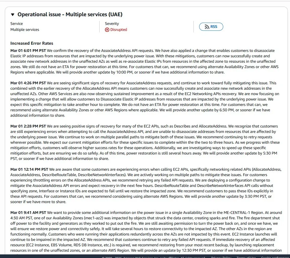 图:AWS 官方状态页的事故通告:阿联酋(UAE)区域(ME-CENTRAL-1)某个可用区因供电事故(数据中心被异物击中引发火花/起火,消防切断电力)导致多项服务与 EC2 网络相关 API 错误率升高、服务受影响。