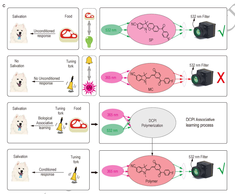 “这正是材料本身的固有性质带来的巧合。我们在对 DCPI 树脂进行光化学特性测试时,偶然发现只有按照‘先紫外光、后可见光’的顺序进行照射,才能快速触发树脂的聚合反应,形成稳定的绿色荧光信号,实现有效的记忆编码;若颠倒时序或单一光照射,都无法完成这一过程,而这一特性恰好与巴甫洛夫实验中‘条件刺激先于非条件刺激’的条件反射逻辑高度契合,我们便顺势利用这一材料特性,构建了贴合生物机制的光联想学习框架。”
