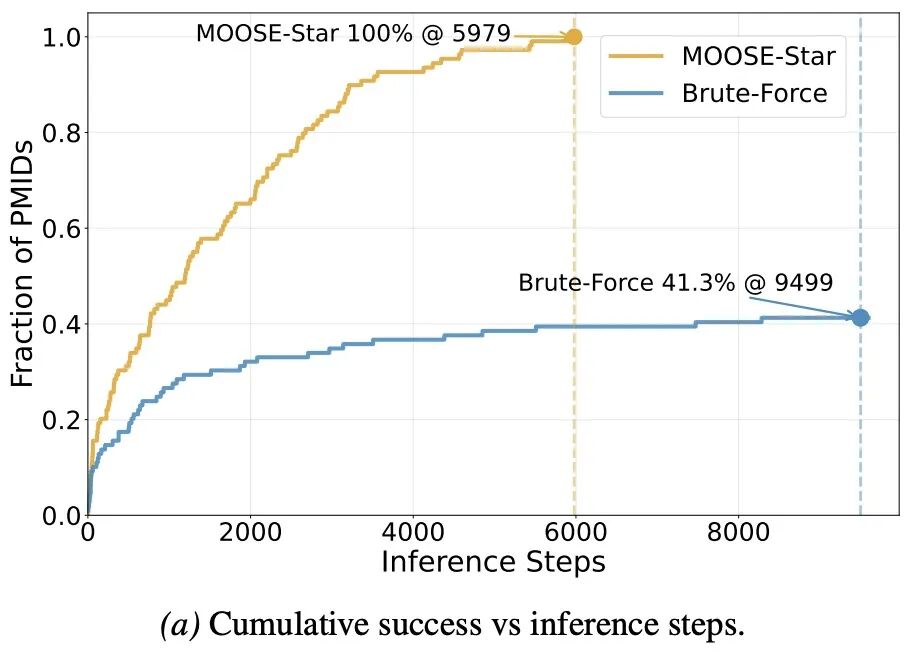 除了训练期的规模化红利,MOOSE-Star 还在推理期展现出了惊人的算力转化率。