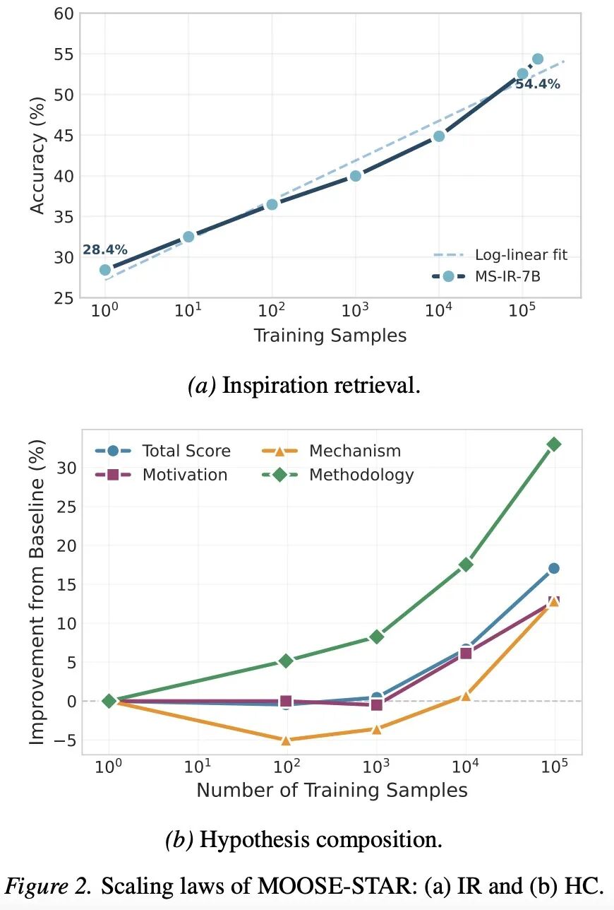 而 MOOSE-Star 的解构与分离训练彻底打破了这一魔咒。该研究证实:随着训练数据量(如 TOMATO-Star 数据集的规模扩张),模型在灵感检索和假设组合上的基础能力,呈现出了可预测的持续提升。这意味着,用 LLM 对科学发现进行直接建模 P (h|b) (不依赖 external feedback) 的能力首次变得「可以通过增加训练算力来 Scale up」。
