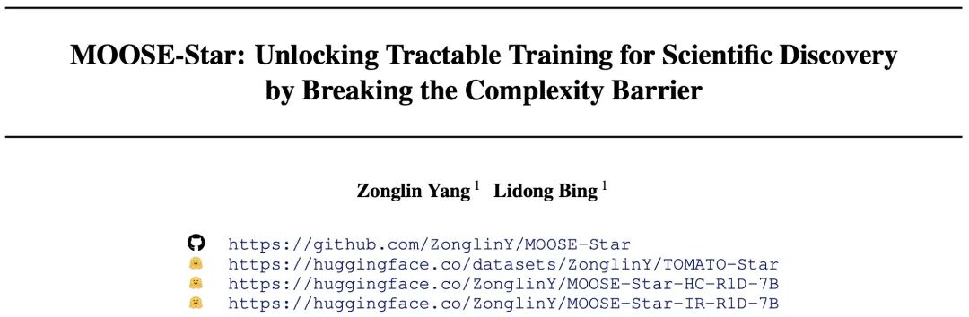 该研究来自 MiroMind AI 的杨宗霖 (Zonglin Yang) 与邴立东 (Lidong Bing) 团队。为了推动直接训练范式在科学发现 (Scientific Discovery) 领域的应用,团队开发并开源了包含超 10.8 万篇高质量论文推导链路的 TOMATO-Star 数据套件 ,以及基于理论框架构建的 MOOSE-Star 模型体系。团队希望以此为契机,携手推动 Scientific Discovery 领域开源社区的建设与发展。